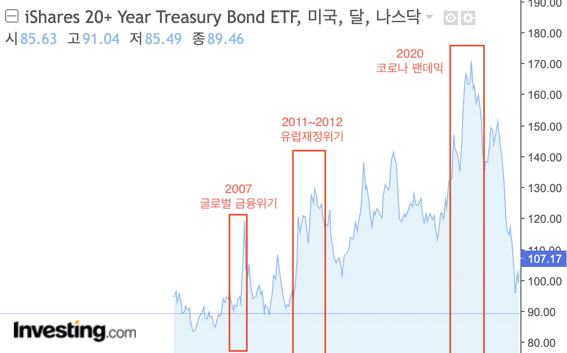 -2011 유럽 재정위기 때 그리스,포르투갈, 스페인 등 국채 금리가 급등하며 미국 장기 국채로 피신하며 TLT상승하였고
